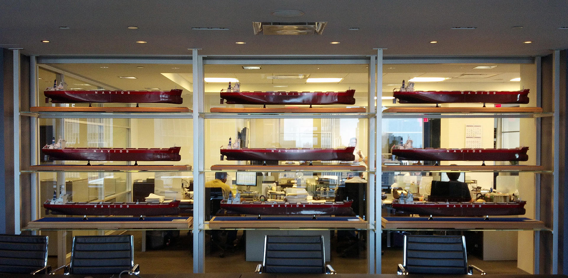 This shipping based company created an office in New York City. The conference room boasts miniature models of their ships along with a fully functioning technological table for all to gather. Additional private offices and an open space deck plan allows all the employees to communicate easily.